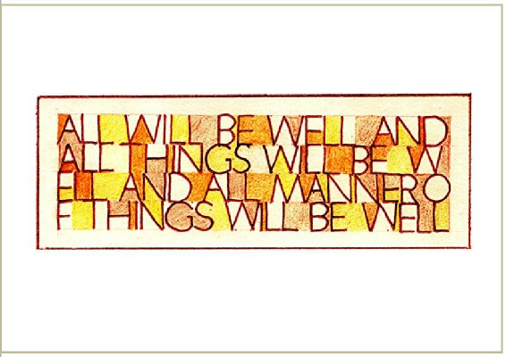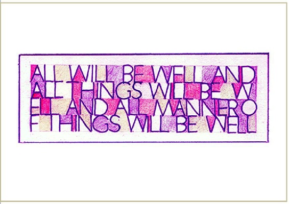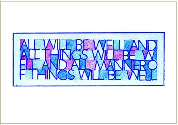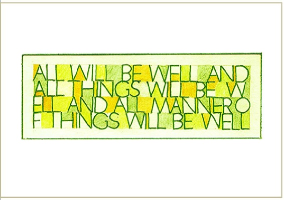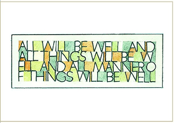 Encouraging words scribed from the sayings of Julian of Norwich.  Hand finished on a silky smooth card (300gsm) with luxury wove white envelope (120gsm). Standard size (A6) to drop a few cheerful words of support. Presentation size (A5)  for a significant occasion.