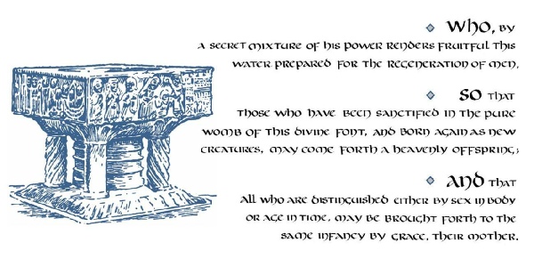 This beautiful prayer is from the Blessing of the Baptismal Waters. From the Easter Vigil; St John’s Sunday Missal, C. Goodcliffe Neale Ltd 1958.  The intricately carved font is formed from a single block of Tournai Limestone weighinb about 1.5 tonnes and dating from about 1150.  It illustrates scenes from the bible.
