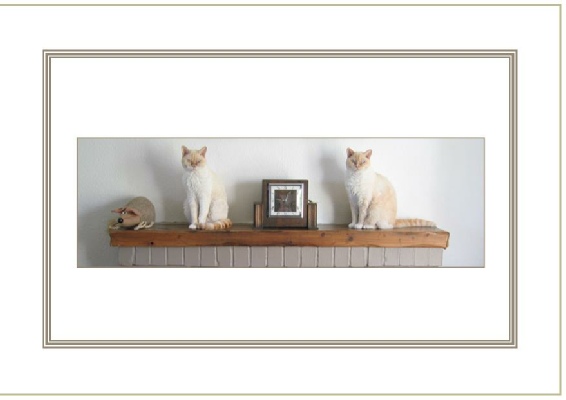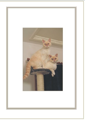 One of a series of cards showing off my new boys!  Selkirk Rex brothers, they resemble nothing quite so much as a pair of tiny sheep.  Jack is of a more lithe build, whereas I think Harry can most politely be described as “sturdy”.  Here they are looking at their superior best.  No hint of the squealing & squabbling that got them both up there in the first place! Not much about calligraphy here you might think, but then a good calligrapher knows when not to interfere. For cat lovers everywhere!
