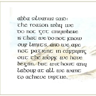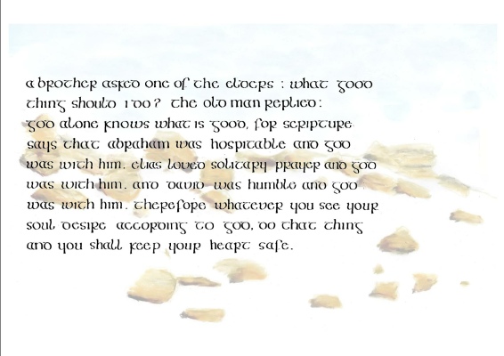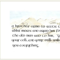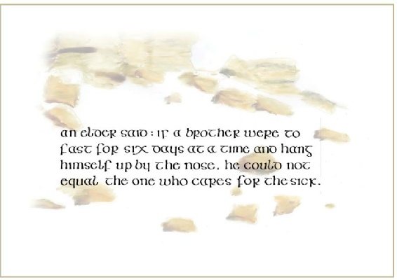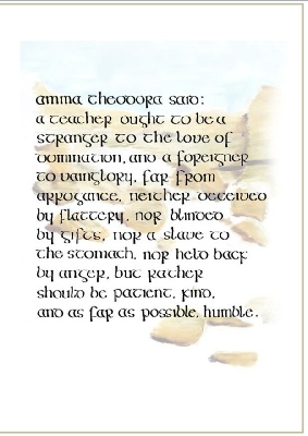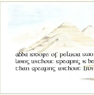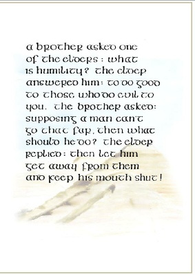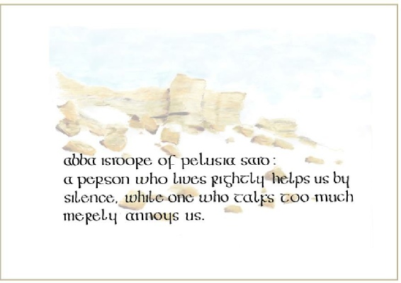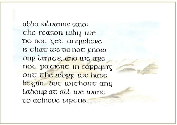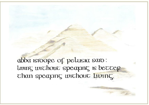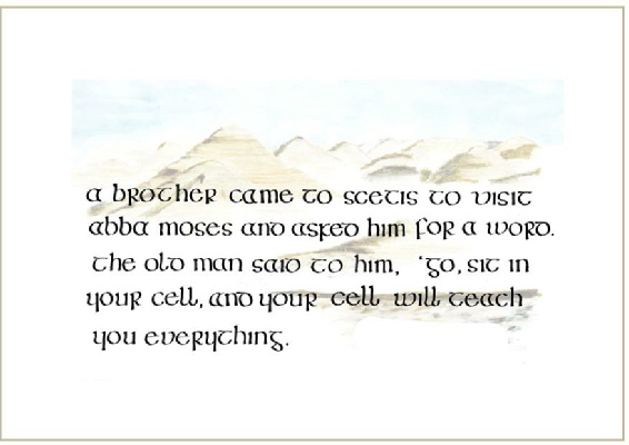 Pithy & wise & full of commonsense, the desert fathers retired to the Sinai desert in the early years of Christianity to search for God & to do battle with the devil.  They refused to underestimate the wily ways of the “demon within”, and their words are a lodestone through the winding paths of mirage and self-deception which can all too easily overtake even the most ardent seeker of truth. Scribed in insular half-uncial  -  a seventh century script from the northern British Isles.  Hand finished on a luxury. pure white, linen effect card accompanied by top quality white envelopes With a luxury white envelope (120gsm).