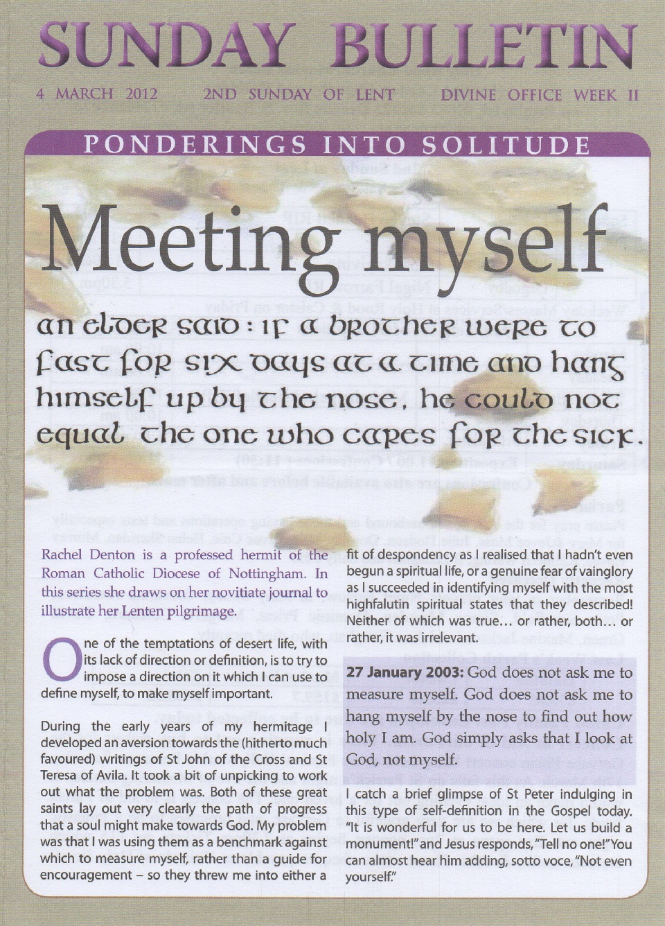 Ponderings into Solitude: Meeting myself.   Rachel Denton is a professed hermit of the Roman Catholic Diocese of Nottingham.  She draws on her novitiate journal to illustrate her Lenten pilgrimage.