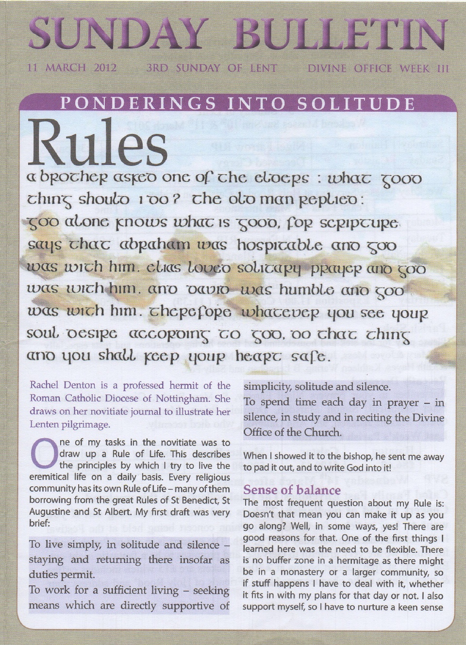 Ponderings into Solitude: Rules.  Rachel Denton is a professed hermit of the Roman Catholic Diocese of Nottingham.  She draws on her novitiate journal to illustrate her Lenten pilgrimage.