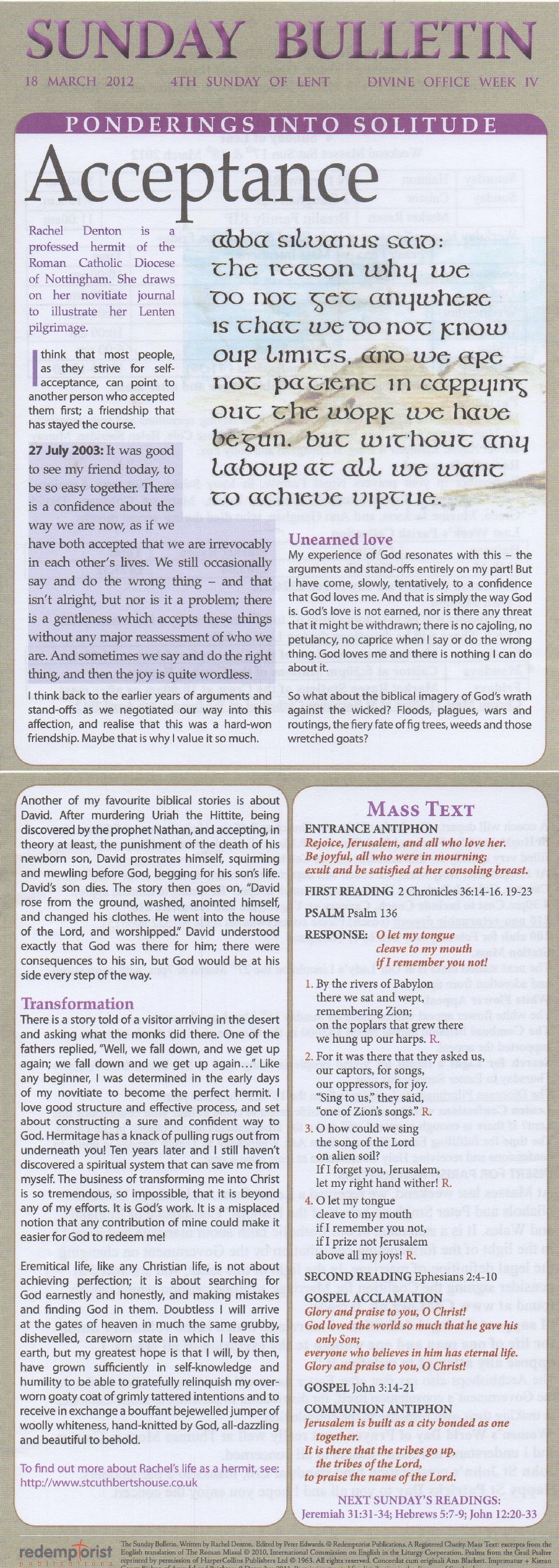 Ponderings into Solitude: Acceptance.   Rachel Denton is a professed hermit of the Roman Catholic Diocese of Nottingham.  She draws on her novitiate journal to illustrate her Lenten pilgrimage.
