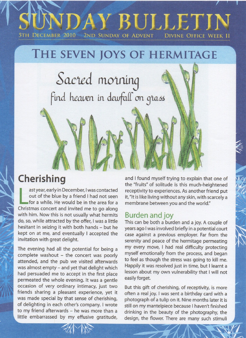 The Seven Joys of Hermitage: Cherishing. After a brief spell in a Carmelite monastery, for the first fifteen years of her working life, Rachel Denton was a teacher. In the summer of 2001 circumstances finally prevailed to enable her to pursue a long-held desire to live in solitude and silence as a hermit. With the support of her spiritual director and the Bishop of Nottingham, she installed herself in a quiet Lincolnshire village and five years later made her solemn profession as a hermit of the Roman Catholic Diocese of Nottingham. Over the next seven weeks, Rachel will be reflecting upon her life in the hermitage during this Advent and Christmas season.