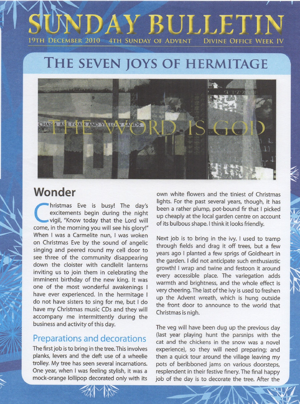The Seven Joys of Hermitage: Wonder. After a brief spell in a Carmelite monastery, for the first fifteen years of her working life, Rachel Denton was a teacher. In the summer of 2001 circumstances finally prevailed to enable her to pursue a long-held desire to live in solitude and silence as a hermit. With the support of her spiritual director and the Bishop of Nottingham, she installed herself in a quiet Lincolnshire village and five years later made her solemn profession as a hermit of the Roman Catholic Diocese of Nottingham. Over the next seven weeks, Rachel will be reflecting upon her life in the hermitage during this Advent and Christmas season.