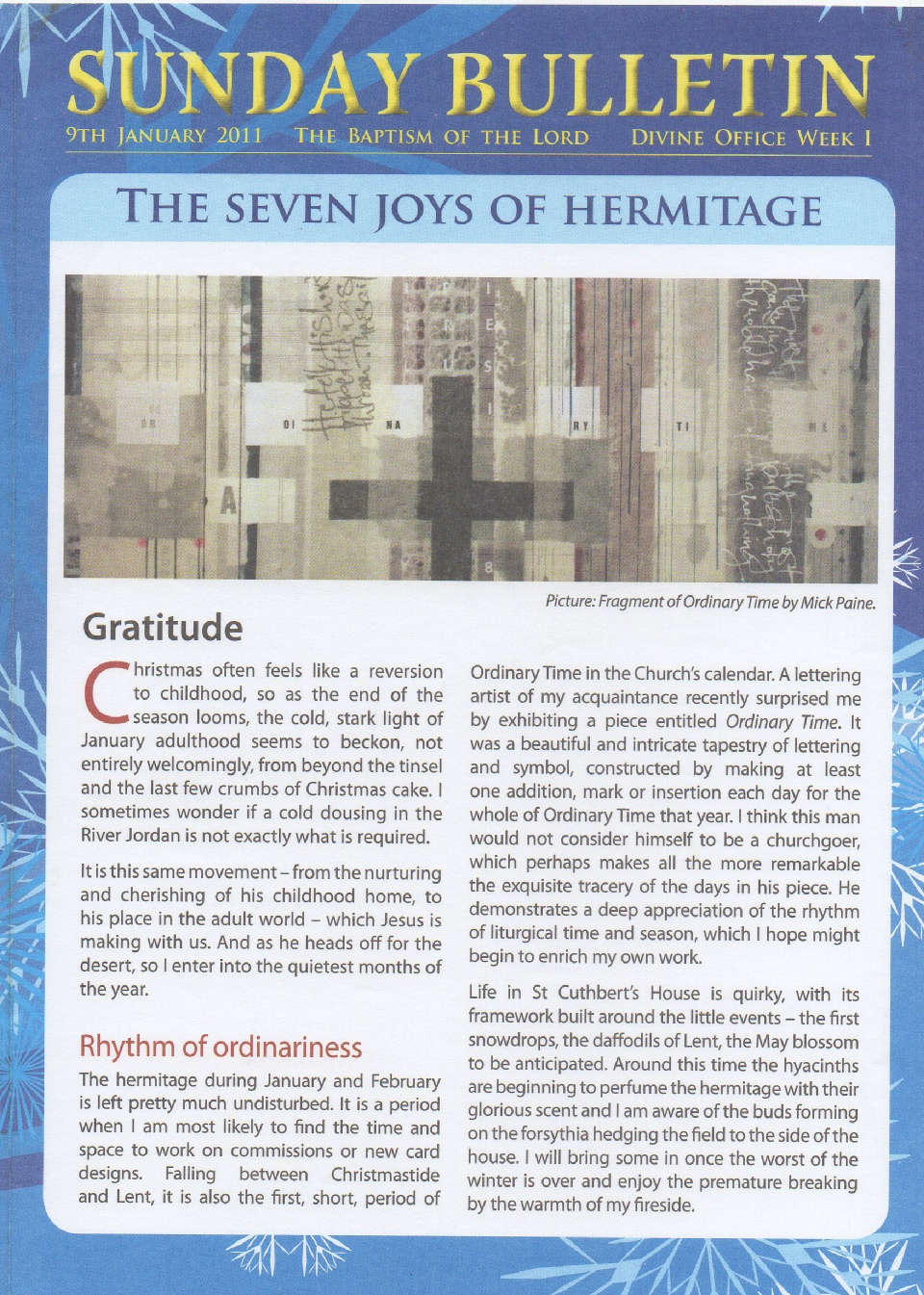 The Seven Joys of Hermitage: Gratitude. After a brief spell in a Carmelite monastery, for the first fifteen years of her working life, Rachel Denton was a teacher. In the summer of 2001 circumstances finally prevailed to enable her to pursue a long-held desire to live in solitude and silence as a hermit. With the support of her spiritual director and the Bishop of Nottingham, she installed herself in a quiet Lincolnshire village and five years later made her solemn profession as a hermit of the Roman Catholic Diocese of Nottingham. Over the next seven weeks, Rachel will be reflecting upon her life in the hermitage during this Advent and Christmas season.