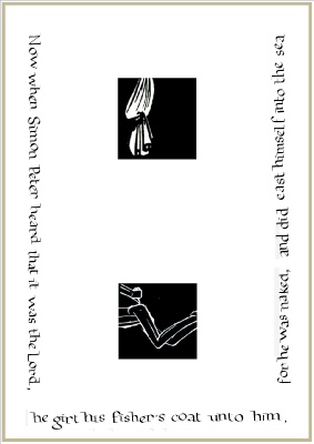 The Stations of the Resurrection, also known by the Latin name Via Lucis (Way of Light), are a form of Christian devotion, encouraging meditation upon the Resurrection of Jesus Christ and some of the Resurrection appearances and other episodes recorded in the New Testament.  They complement the Stations of the Cross or Via Crucis (the term Via Lucis is intentionally reminiscent of this).  The illustrations I have used are derived from Eric Gill’s Stations of the Cross.  They are reverse images (negatives) of tiny slices of the originals.  It was a thought-provoking experience to take the stuff of sorrow, violence and desolation associated with such a controversial artist, and to “redeem” it into the transformative joy of Easter.